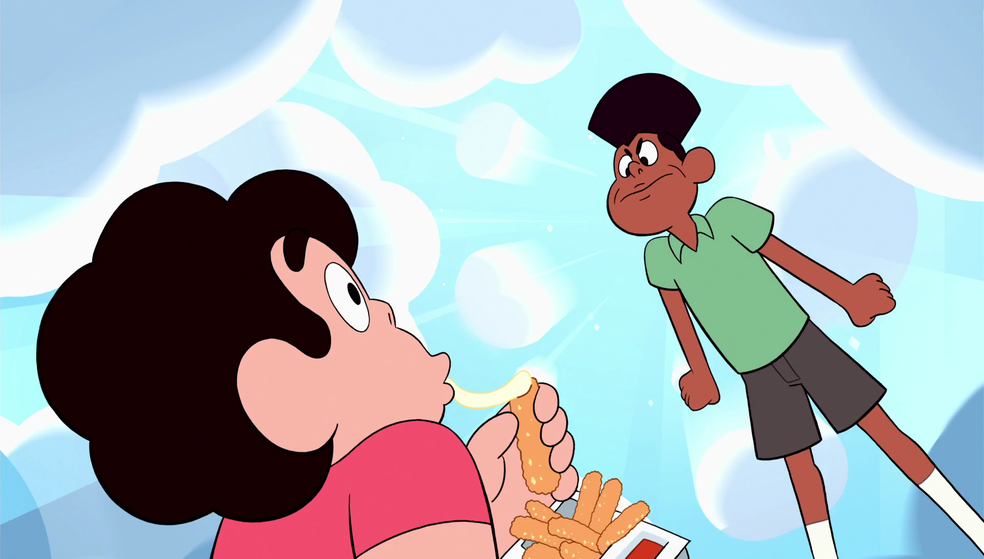 While at the Fry Shack, Steven is about to order his regular choice of fry bits. He decides, however, he wants a change and orders off-menu. This is much to Peedee's annoyance, but he later comes out with a tray of mozzarella sticks and marinara sauce (for dipping), which Steven happily accepts. As Steven munches on his new snack, he walks by Fish Stew Pizza where Kofi goes into a rage upon seeing the mozzarella sticks. Kofi declares the sticks have the same ingredients as pizza and thinks Fryman is infringing upon his business. This leads to Kofi putting up a sign saying "Now serving fries". Fryman sees the sign, and he and Kofi both agree to a new restaurant war.