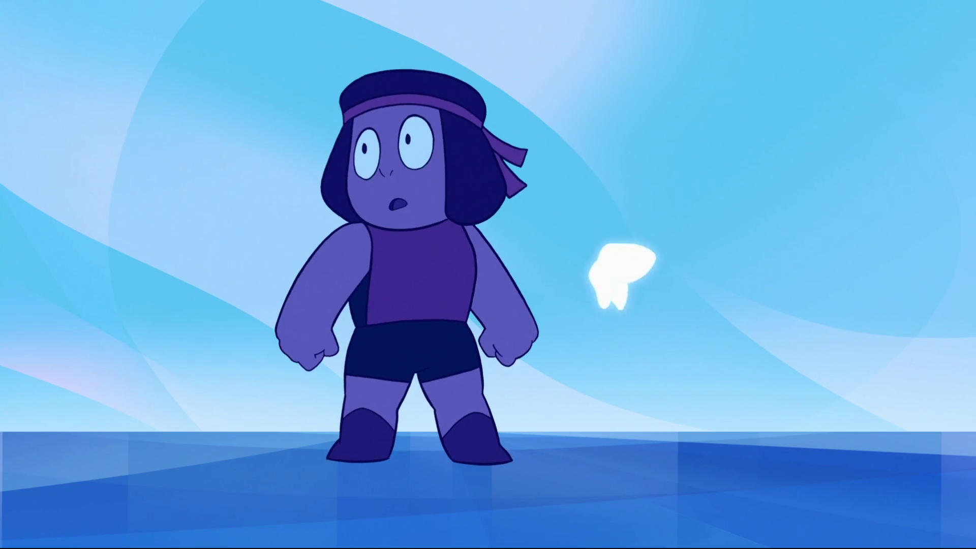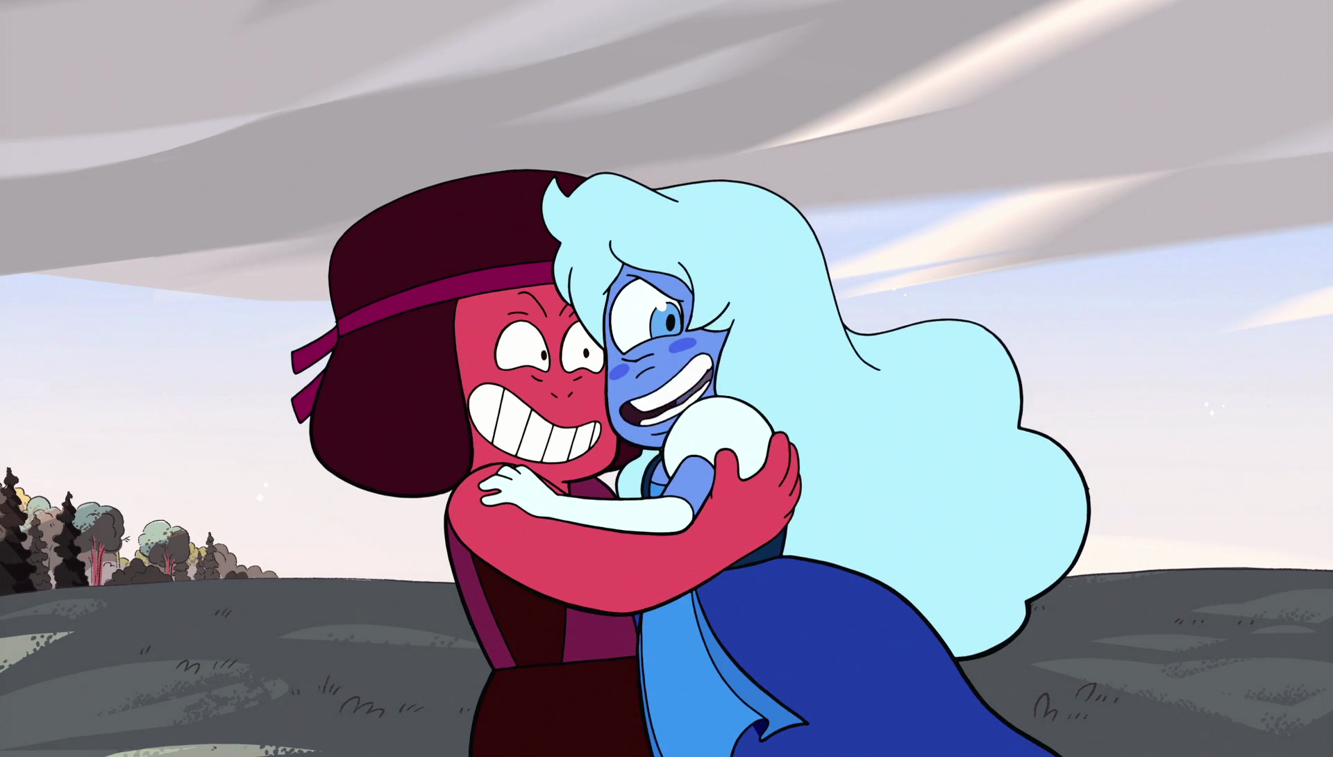 Ruby was distraught that she was unable to protect Sapphire. When it began to rain, she carried Sapphire to a cave for shelter, where she saw Sapphire's single eye for the first time. The two talked about their experience and feelings being fused as Garnet.