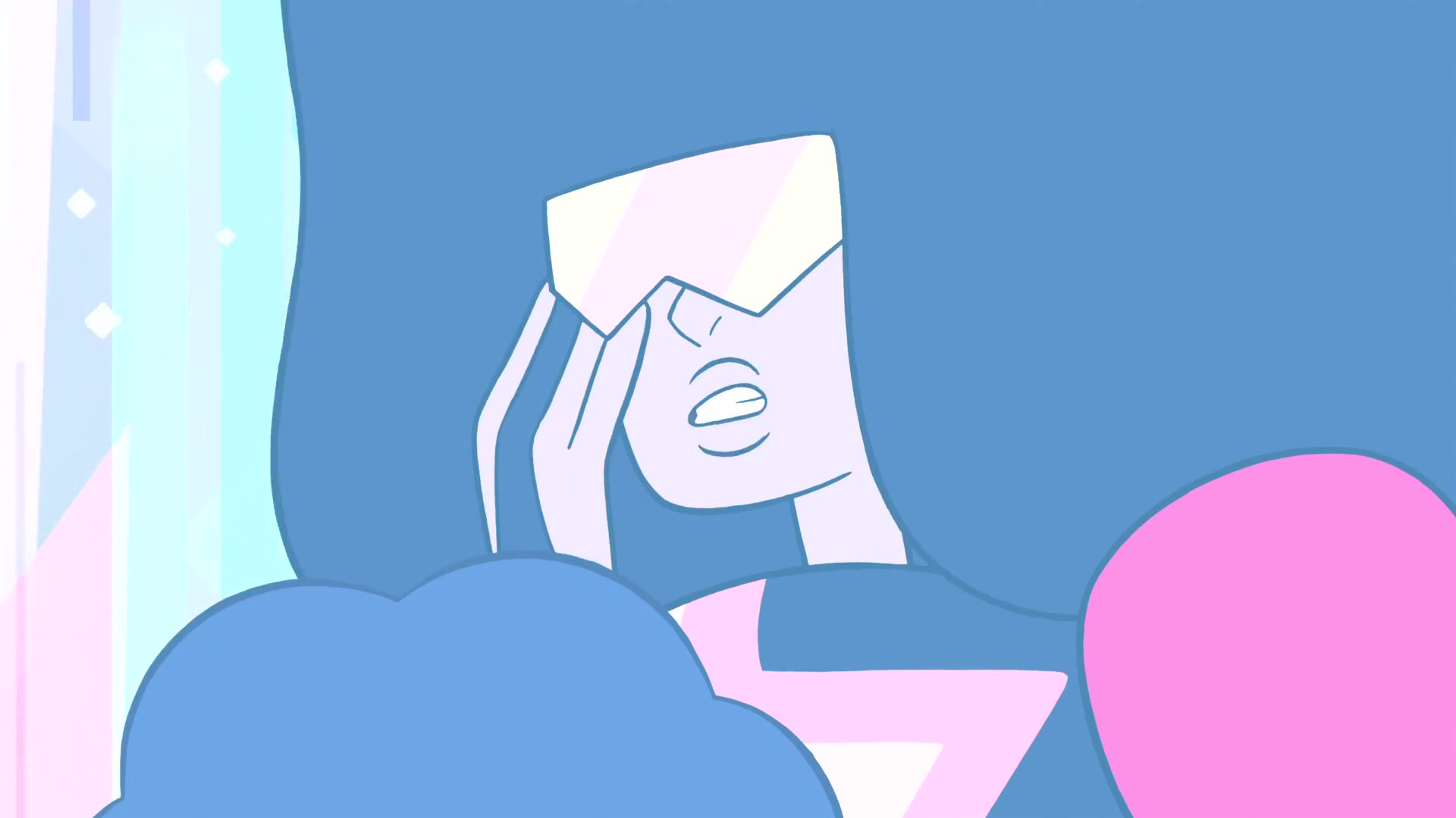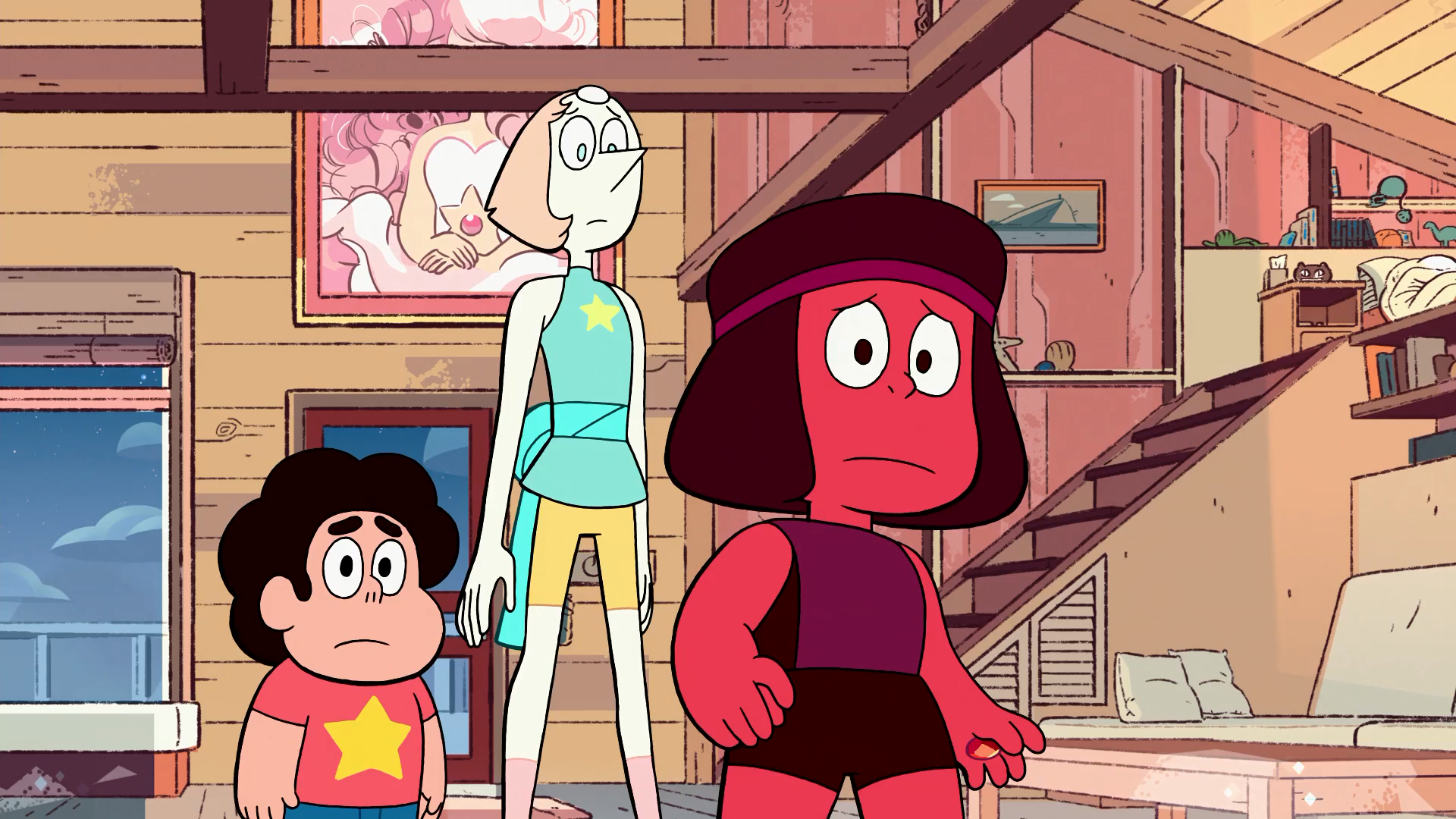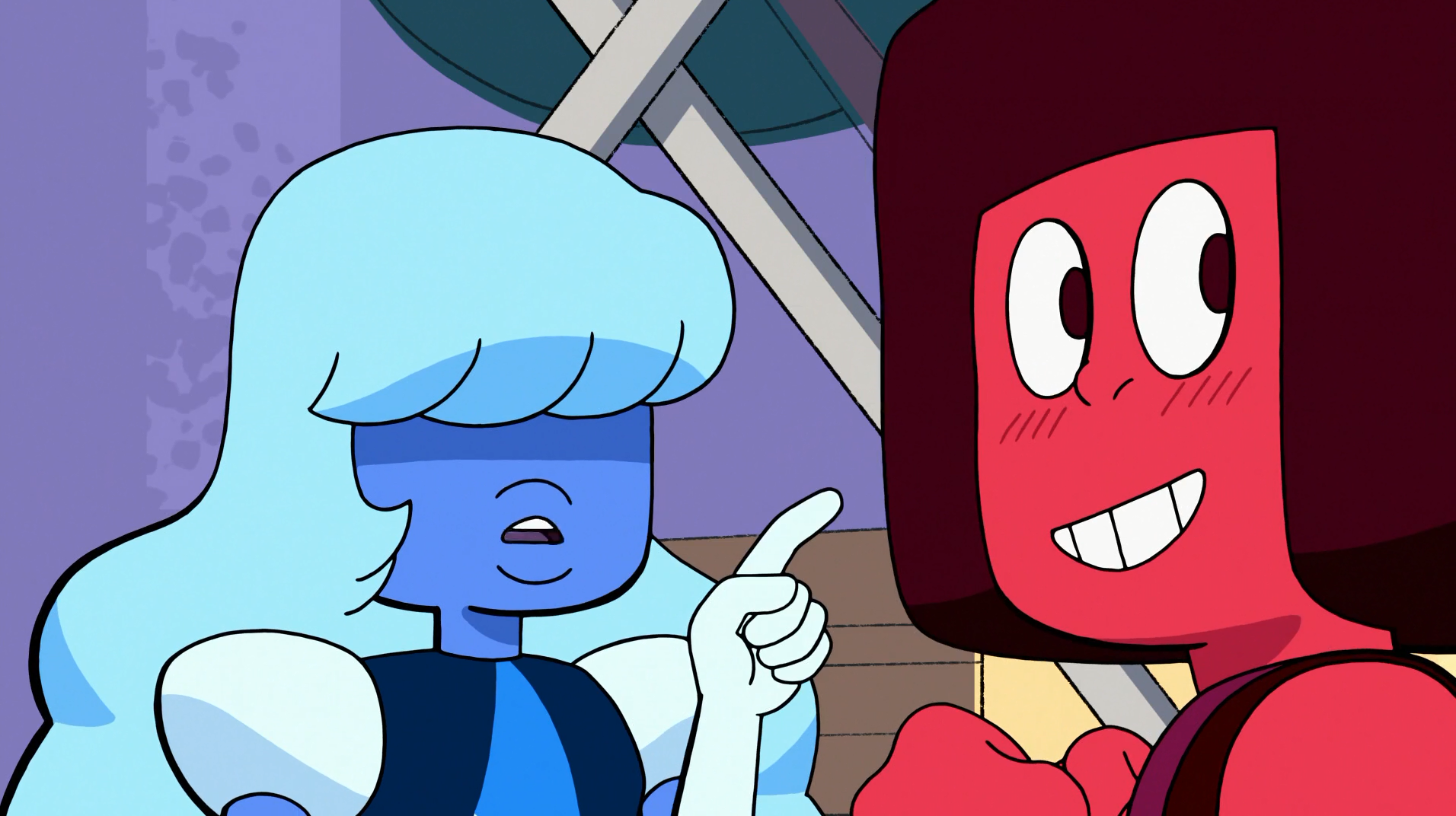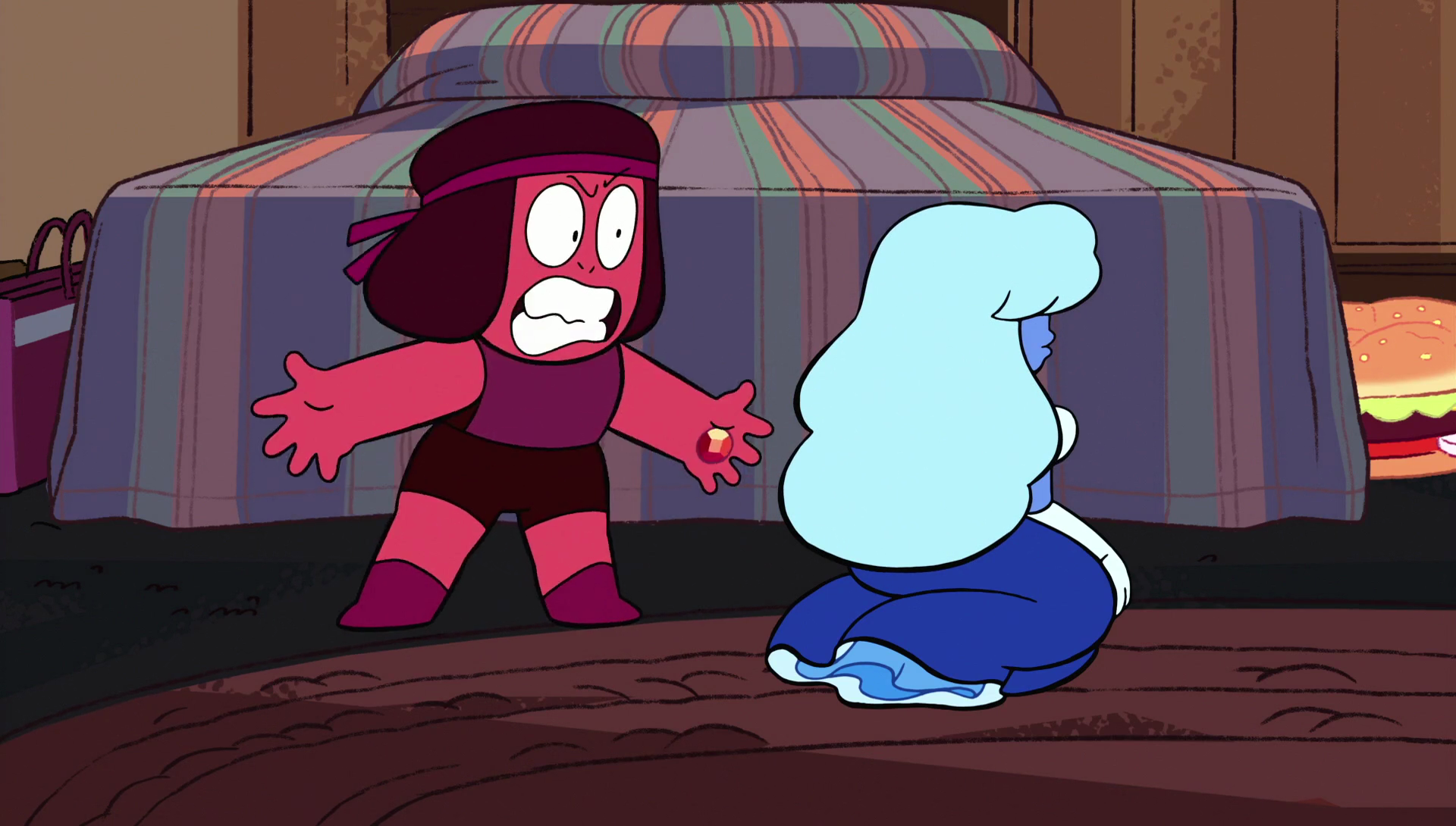 Ruby and Sapphire converse while they are Garnet after they see the Cluster Gems. Garnet almost unfuses, but Ruby and Sapphire find peace once again. Ruby becomes enraged and Sapphire tries to calm her down.
