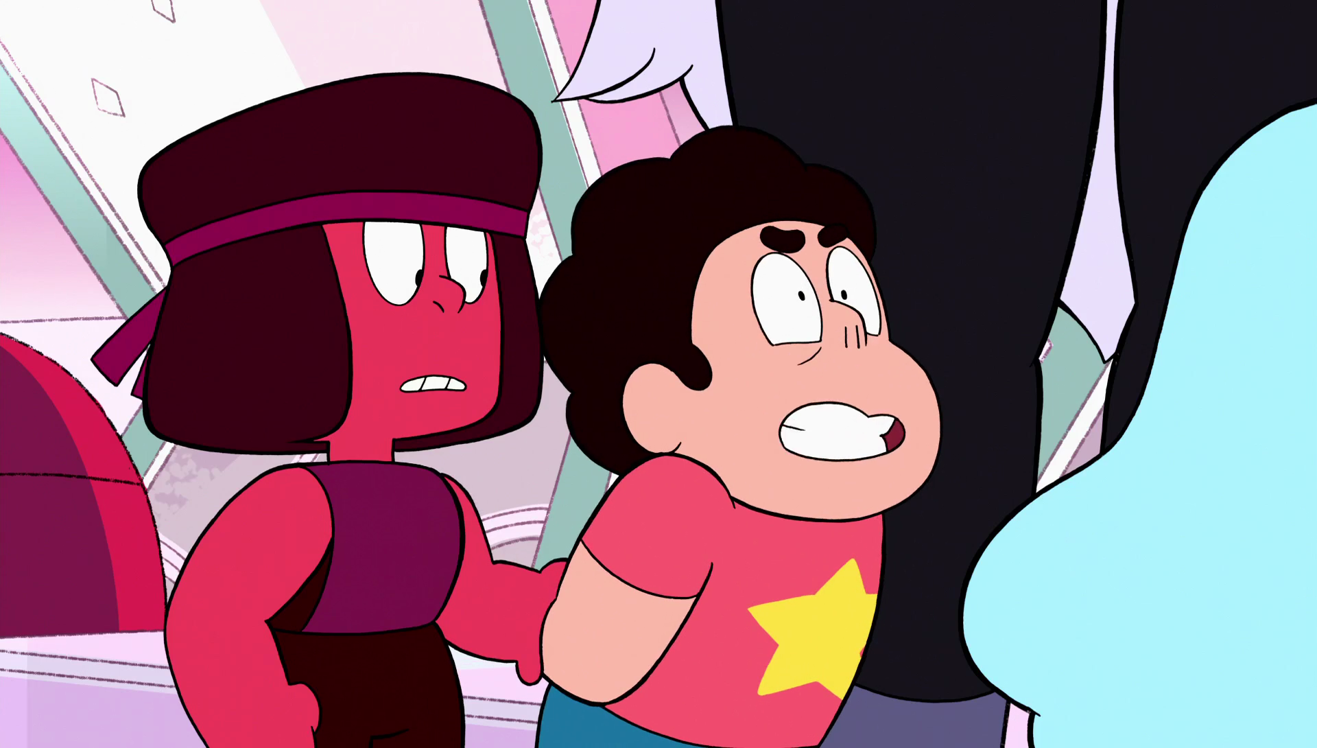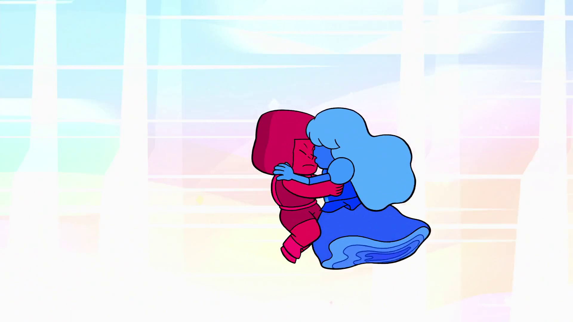When Garnet is teaching Stevonnie how to stay fused under stress, Ruby is shown to get frustrated, but then have Sapphire comfort her, teaching Steven and Connie that they have to work together to stay together.