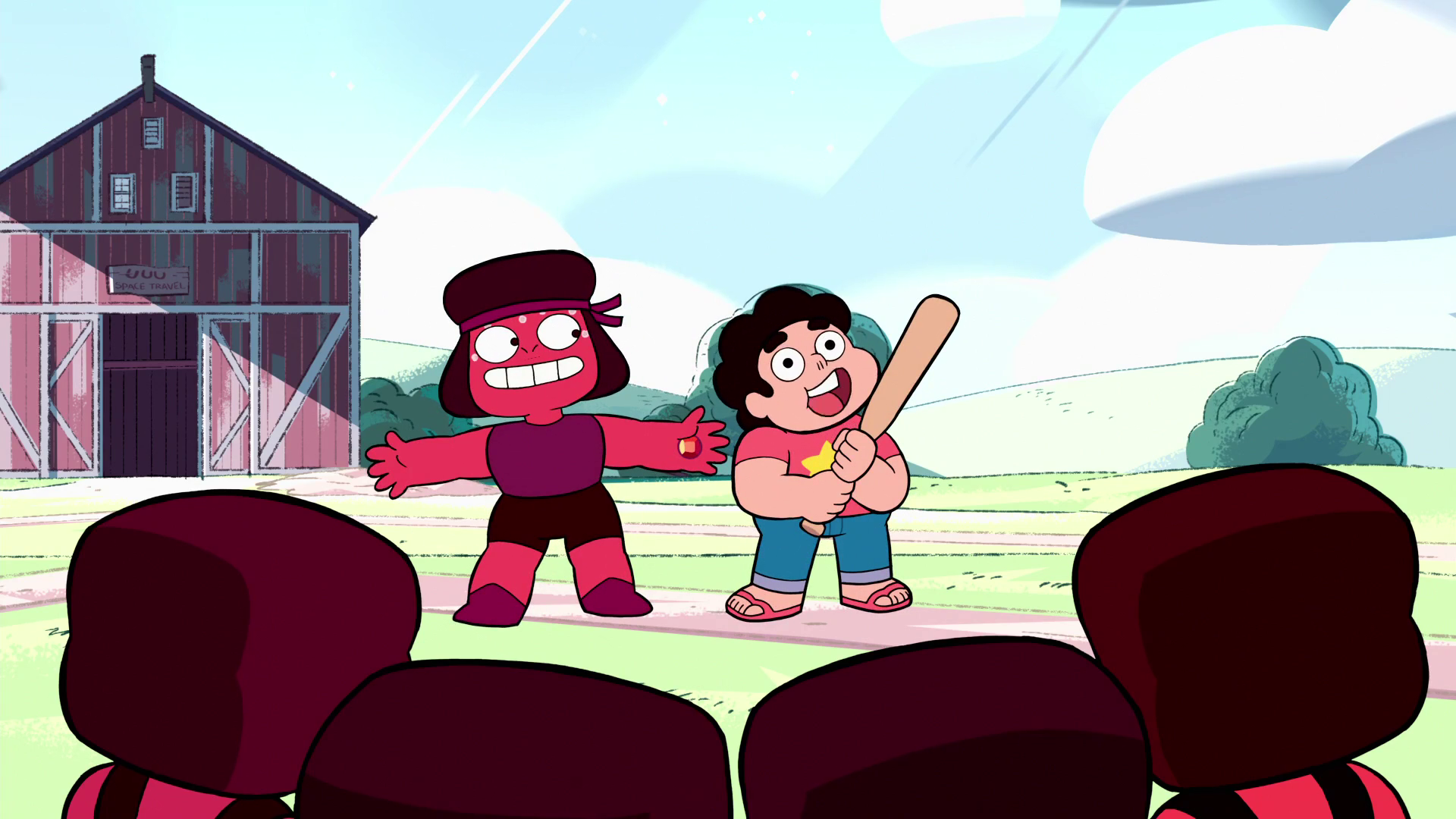 A Ruby squadron arrives at the Barn, leading Garnet to unfuse so Ruby can get them to leave. Ruby nervously sneaks over and blends in with the other Rubies. She gets information by asking what the plan is. After finding out they are looking for the leader of the Earth mission, whom Ruby believes is Peridot, she tells the others that she will search the Barn. Ruby returns to the others, who are hiding in the barn, very anxiously. Sapphire calms her down and helps her out by suggesting she go back and telling the other Rubies that the Barn is a human home. Steven goes with Ruby to prove that the Barn is nothing but a human facility. Ruby tries to get them to leave once more, but Doc orders the Rubies to double check the Barn. Steven compromises by saying the Rubies can search the barn if they beat the "humans" in a game of baseball.