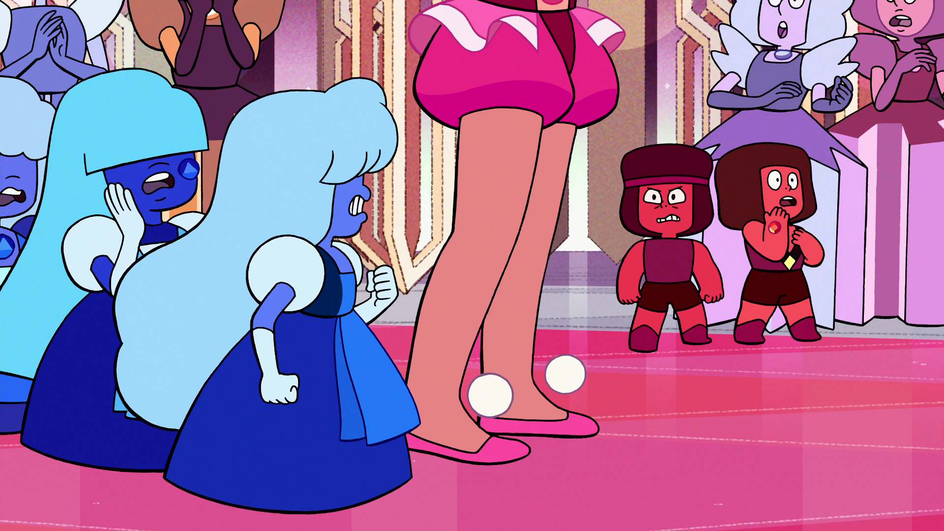 Ruby and Sapphire are forced to split in order to attend the Era 3 Ball, so Ruby attends with the other Rubies, and Sapphire with the Sapphires. However, when Steven accidentally fuses with Connie, much to the outrage of the Diamonds, the two fuse again, becoming Garnet and defending Steven. They are immediately poofed by Yellow Diamond's electrokinesis.
