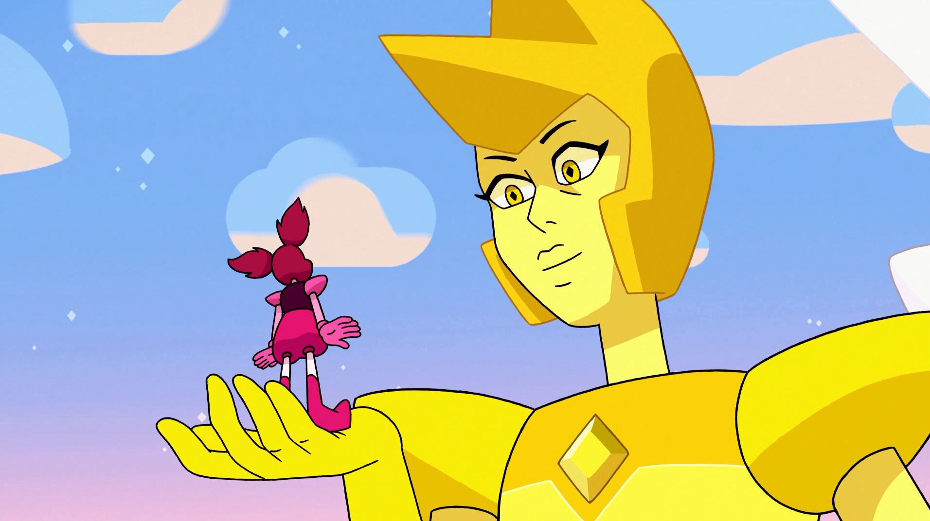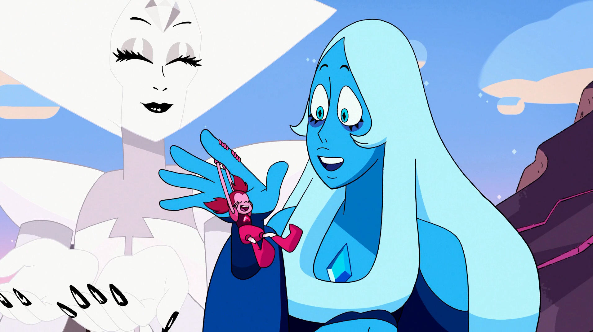 Upon their first encounter with Spinel in millennia, the once oblivious Diamonds seem to remember Spinel immediately, Yellow even calling her "Pink's little playmate"; She is shown to be amused by Spinel's jokes and antics. As for Blue Diamond, she calls Spinel one of "Pink's lost treasures" and shows sympathy after learning of her abandonment by Pink, but takes a liking to Spinel primarily due to her resemblance to the latter. White proposes the idea of taking Spinel to Homeworld with them and letting her stay in the Diamond Palace, to which Spinel agrees, expressing gratitude for being able to try her hand at making friends again.