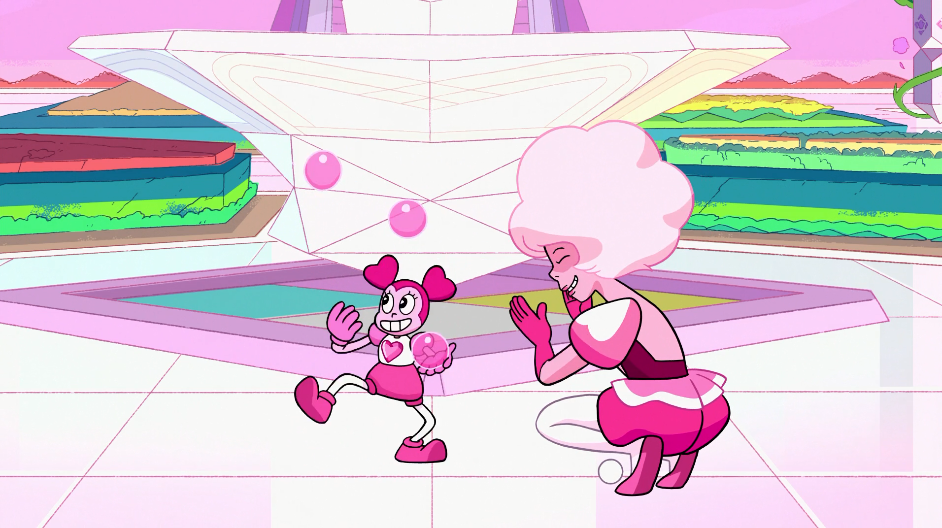 Spinel was Pink Diamond's playmate and "best friend". Created solely to entertain Pink, Spinel considered herself to be Pink's best friend, and for a time, the two were inseparable. However, they gradually grew apart as Pink yearned to have a colony of her own. Oblivious to this, Spinel continued to attempt to entertain Pink, her attitude now seeming more immature in comparison. She also became clingy; upon Pink's allocation of Earth as her colony by the Diamonds, Spinel was intent on joining Pink on this new endeavor.