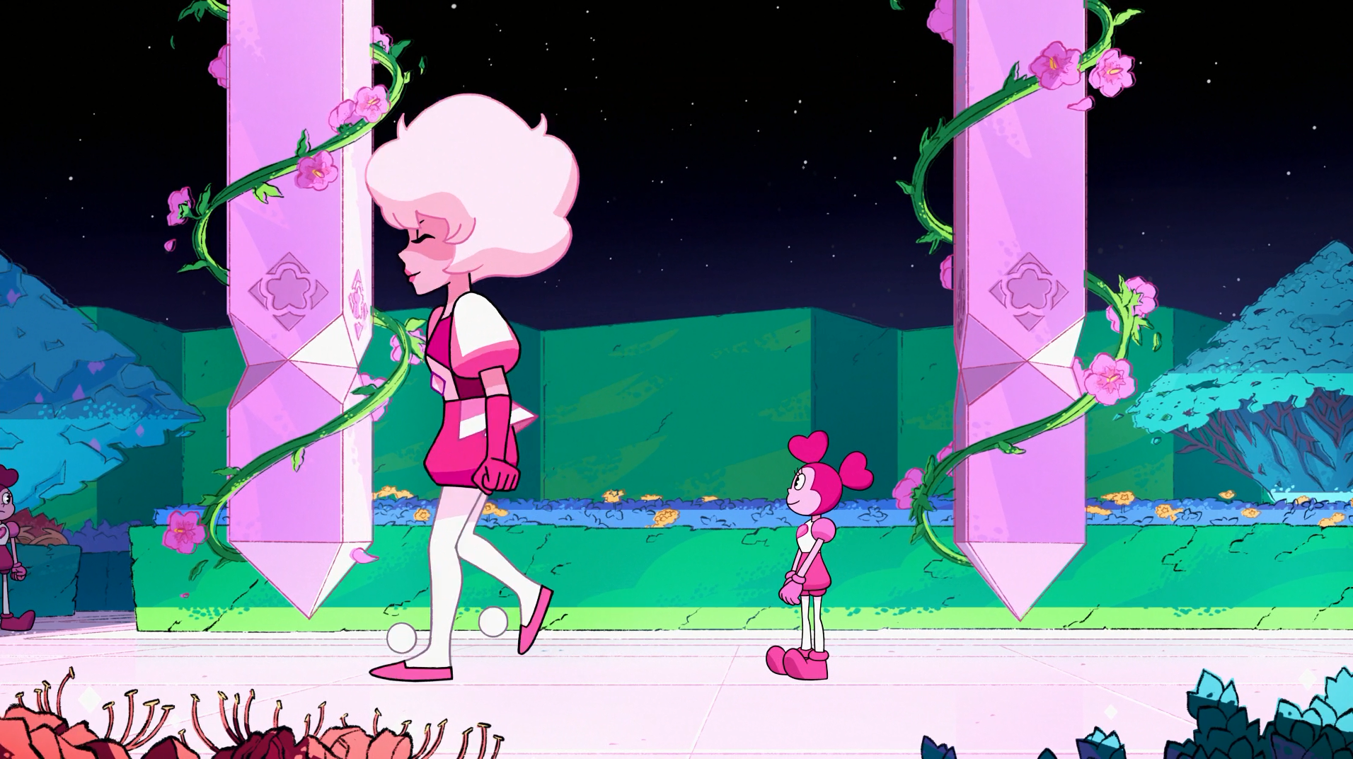 Spinel was created for Pink Diamond thousands of years ago to act like her new best friend (after losing her first Pearl), often playing games with her and entertaining her. However, over time, Pink began to see Spinel as inconsiderately naive and slowly outgrew her, becoming visibly less and less enthusiastic about constantly playing with her. When Pink was finally given her colony, Earth, she abandoned Spinel at the garden built for them, saying that they were going to play a new game where Spinel had to stand perfectly still. Spinel was eager to play the game and stood motionless for 6,000 years while waiting for Pink's return.