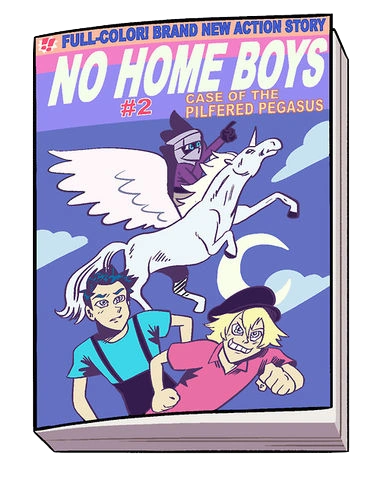 No Home Boys #2: Case of the Pilfered Pegasus is a graphic novel adaptation of the fictional No Home Boys book franchise. It is first seen in the episode "On the Run" and featured on Ronaldo Fryman's blog, Keep Beach City Weird.