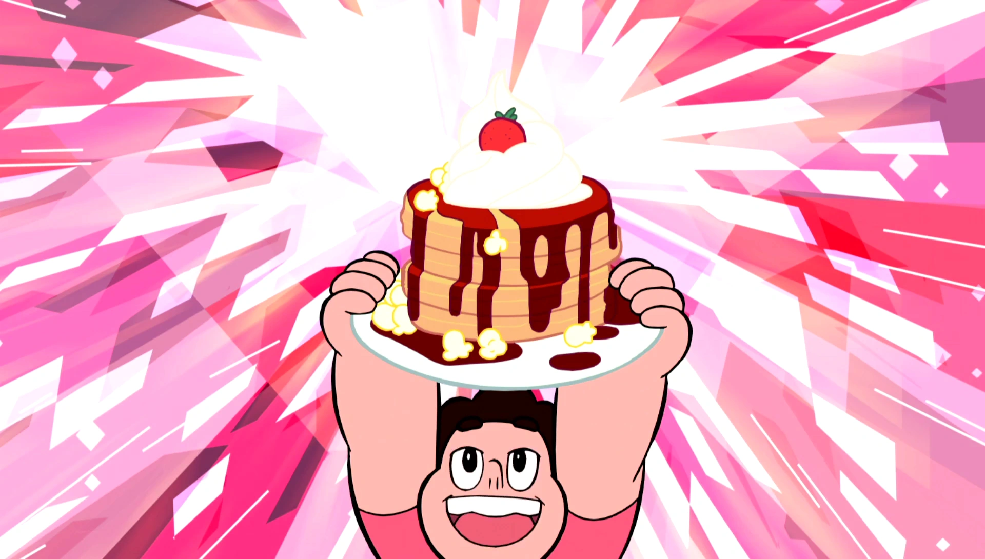 The episode begins with Steven looking out the window on an early Beach City morning. With the gems nowhere to be found, he decides to make breakfast and starts by stacking a tower of waffles. With each failed attempt at finding the gems, he continues preparing the meal with a new addition. He piles on numerous toppings — syrup, whipped cream, popcorn-completing the breakfast with a strawberry garnish on top before declaring it perfect. When it’s complete, he decides that it’s too delectable for just him to eat, christening it the “Together Breakfast”.