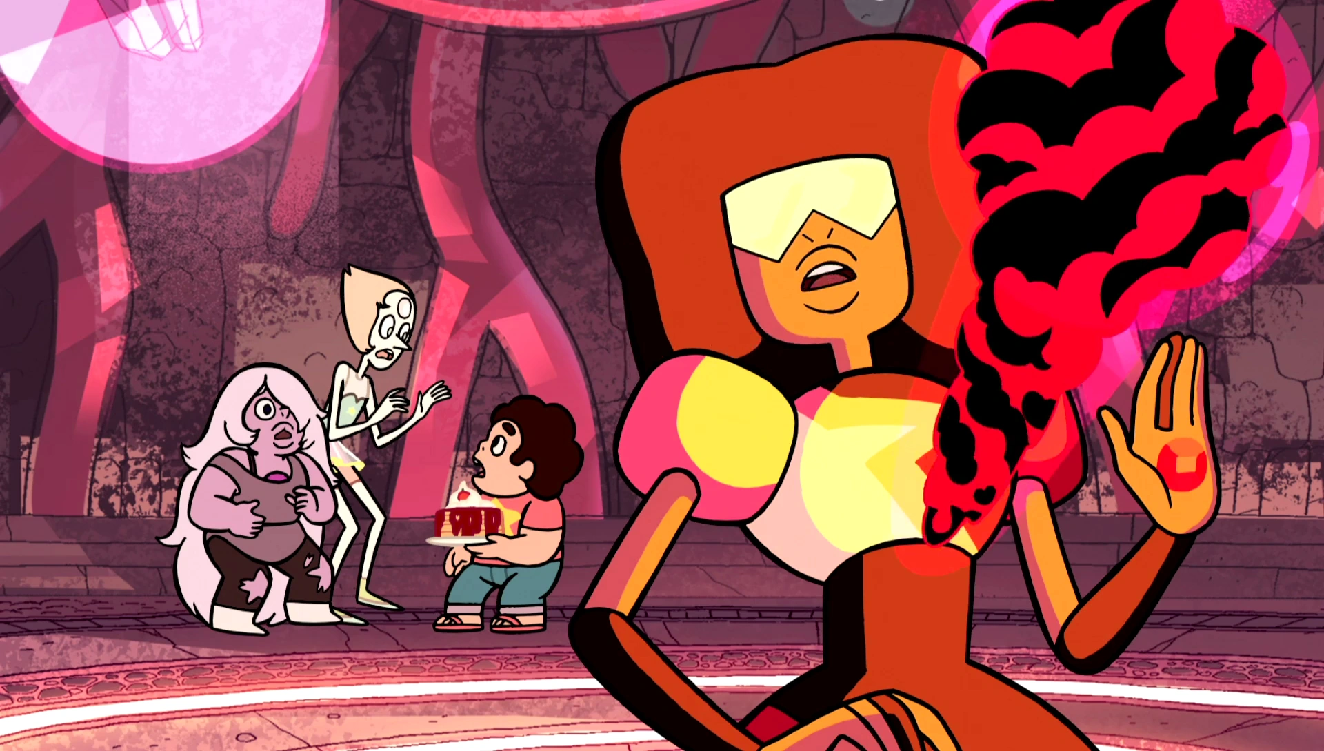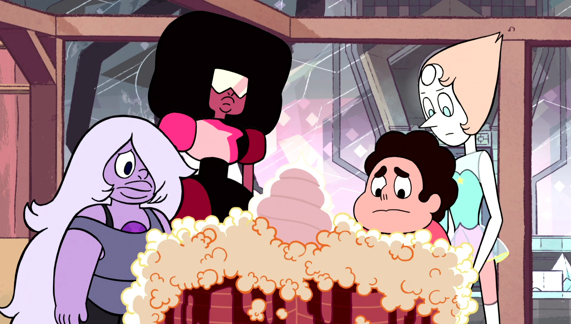 Steven and the gems uncomfortably gazing upon the new and improved Together Breakfast (the predecessor of which that tried to kill them).