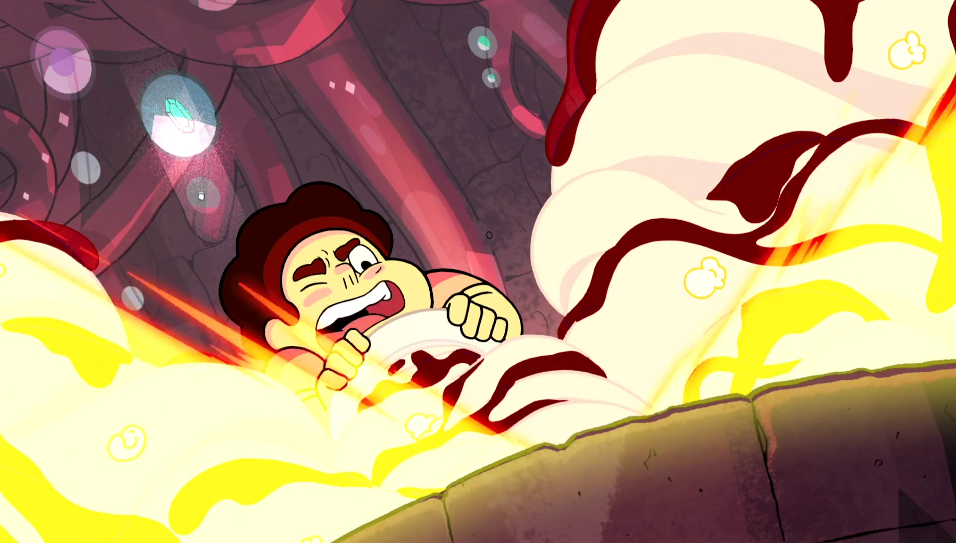 The Crystal Gems attack the cloud, trying to force it back. The monster rushes at Steven and takes refuge in the Together Breakfast. The breakfast mutates, growing larger, and attacks the Gems. Utilizing the powers of a breakfast, it breaks Pearl's spear and traps her with syrup and whipped cream. It then traps Garnet and Amethyst by smashing them into a wall with a waffle. Refusing to stand by in the presence of his edible symbol for friendship being used as a vessel of evil, Steven gets up and is able to lift and force the Together Breakfast into the lava pool.