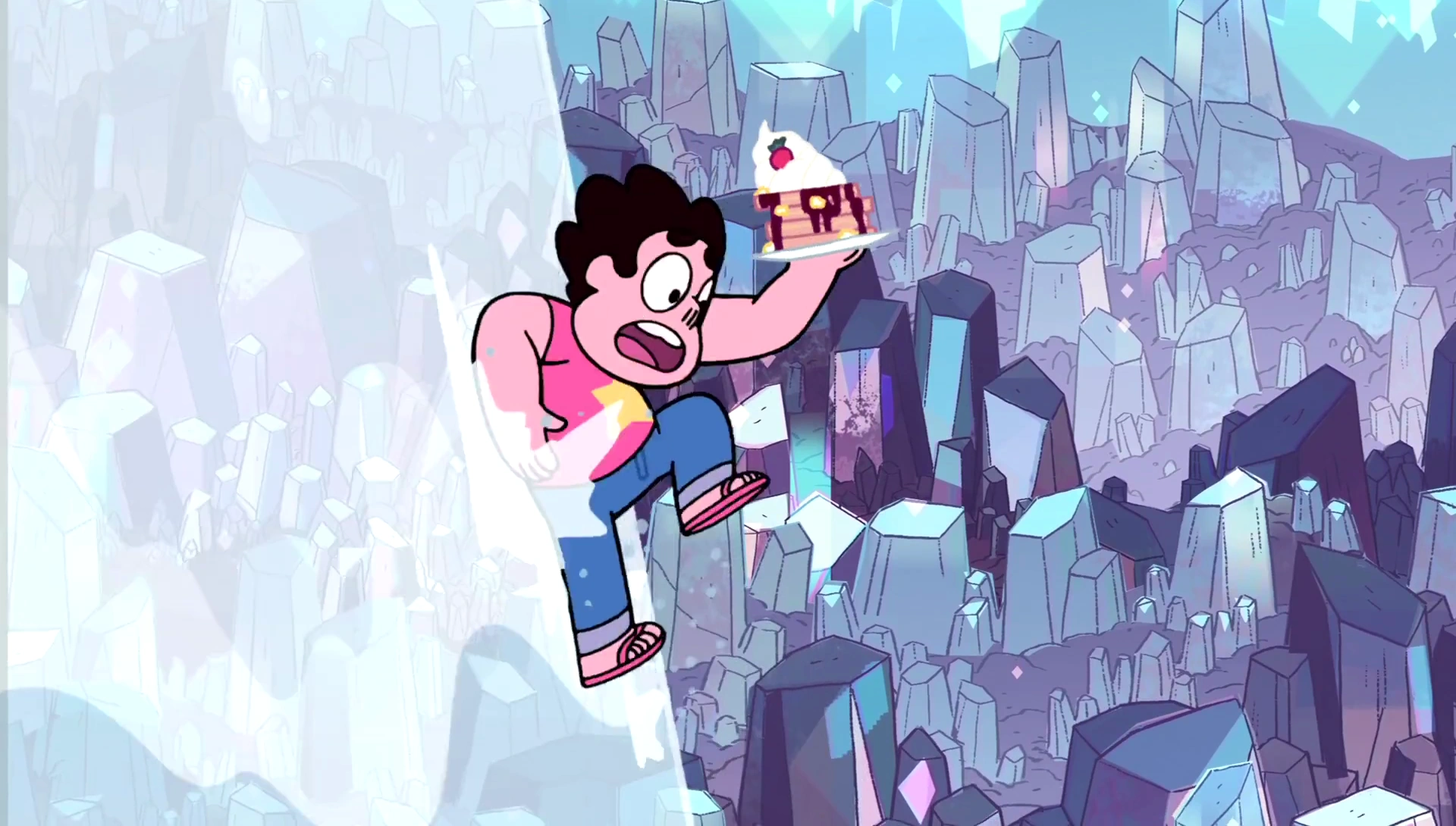 Steven falling down a pimped-out waterfall with his Together Breakfast still in one piece (in a matter of speaking)