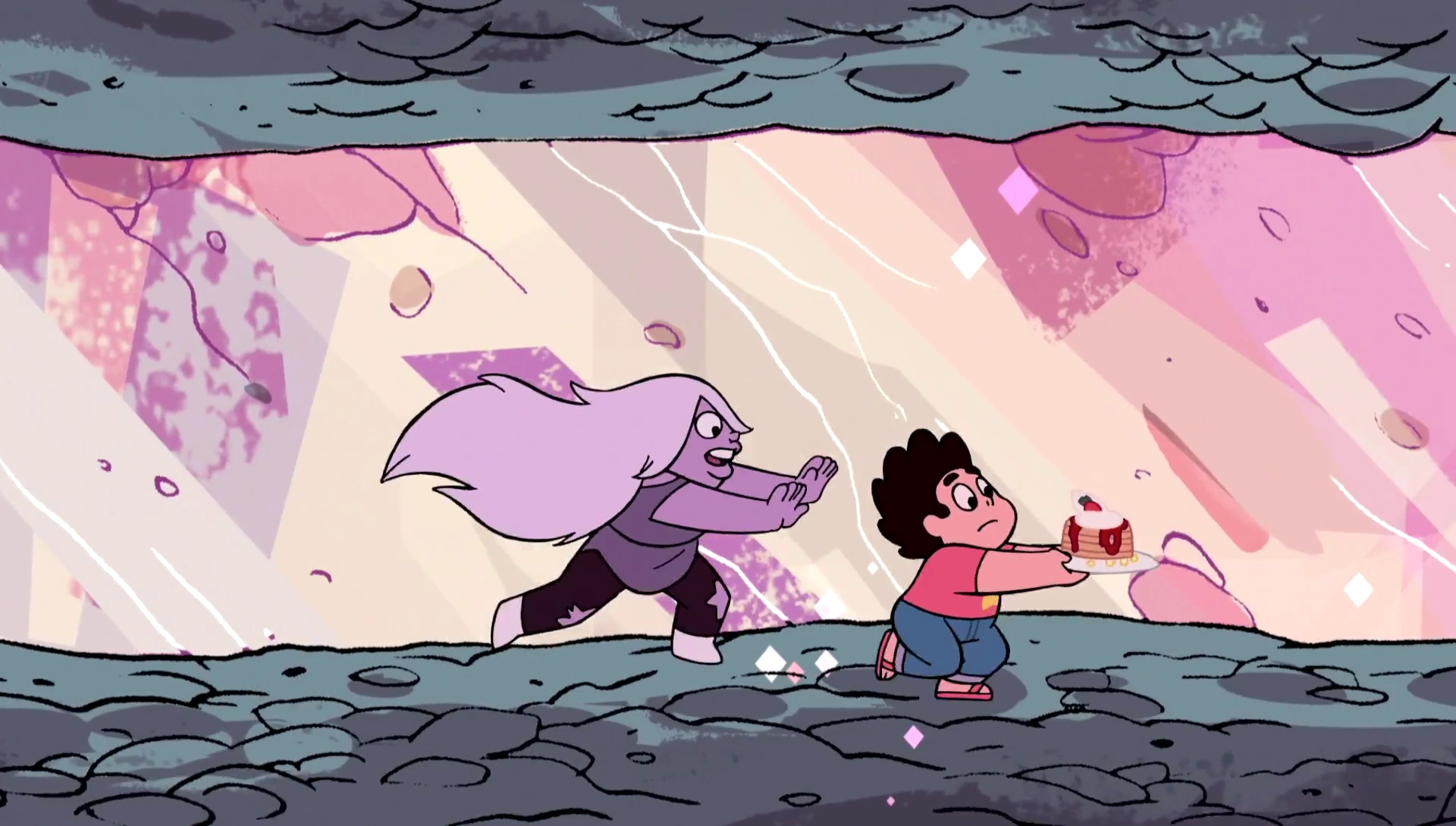 Steven washes ashore still managing to hold his Together Breakfast together and finds Amethyst, revealing this to be her room. Amethyst is busy recreating the chaos of her messy room and is greeted by Steven, who notes that he came in through the waterfall. She explains that Pearl always accuses her of taking her things, but in reality, they always fall down the waterfall into Amethyst's room. She then proceeds to mess up her room again to her standards. To that end, she jokingly throws Steven onto the junk pile, giving him a bird’s eye view of her process. Steven says that it still looks pretty messy, which pleases her. She then notices Steven's breakfast and she insists on eating it. Steven refuses her anywhere near it, telling her that the best part of it is eating it with all their favorite people. Amethyst doesn’t get it and ferociously pounces for it, forcing Steven to run for it. Amethyst chases Steven through a network of reality-bending corridors while Steven vainly tells Amethyst that she’s completely missing the point of Together Breakfast. The whole time, he’s still able to keep it intact long enough for him to eventually reach a red glowing pipeline.