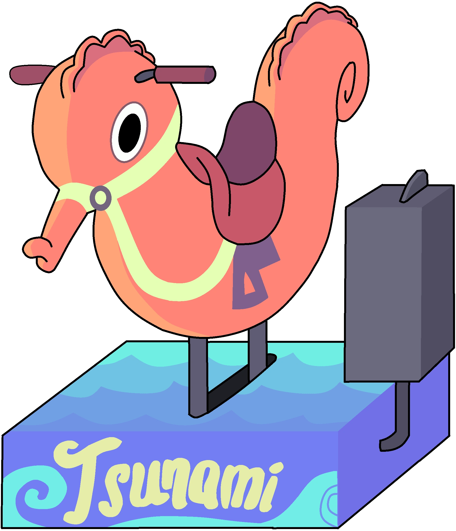 Tsunami is a dark orange seahorse ride. It is decorated with painted on pale yellow reins, a dark pink bridle, a brown saddle, and it has dark magenta bars attached to either side of its head.